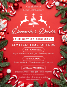 - DECEMBER DOUBLES -Saturday, Dec 13th, bring-your-own-partner, best-shot doubles, featuring 1 round on the normal Red Course. Flex start, payouts for all divisions, Ace Pot, flex start. Learn more & register.