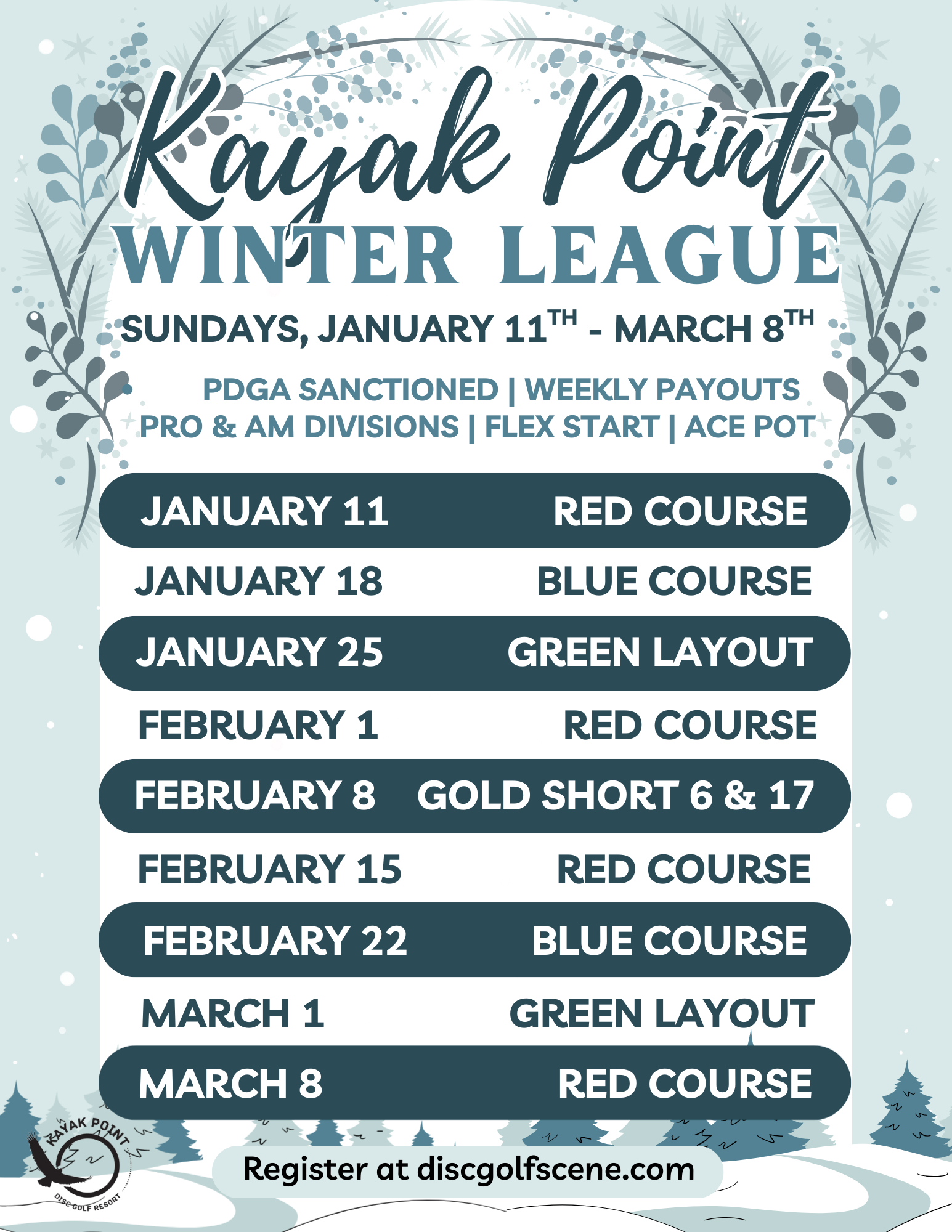 - WINTER LEAGUE – Every Sunday, January 11th – March 8th, Pro/Am PDGA sanctioned league series featuring 9 rounds across the Red, Blue, and Gold Courses. Wide range of divisions with weekly payouts to all divisions. League Ace Pot and trophies for 1st place points winners at the end of the series. Registration will open on discgolfscene.com in December for all 9 weekly events.