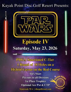 - PAR WARS: EPISODE IV – Saturday, May 23rd PDGA sanctioned Pro/Am C-tier tournament featuring a single round of 18 holes on the Red Course using a unique blend on Red and Green tees. Payouts for all divisions, Ace Pot, CTP’s, raffle. Learn more & register.