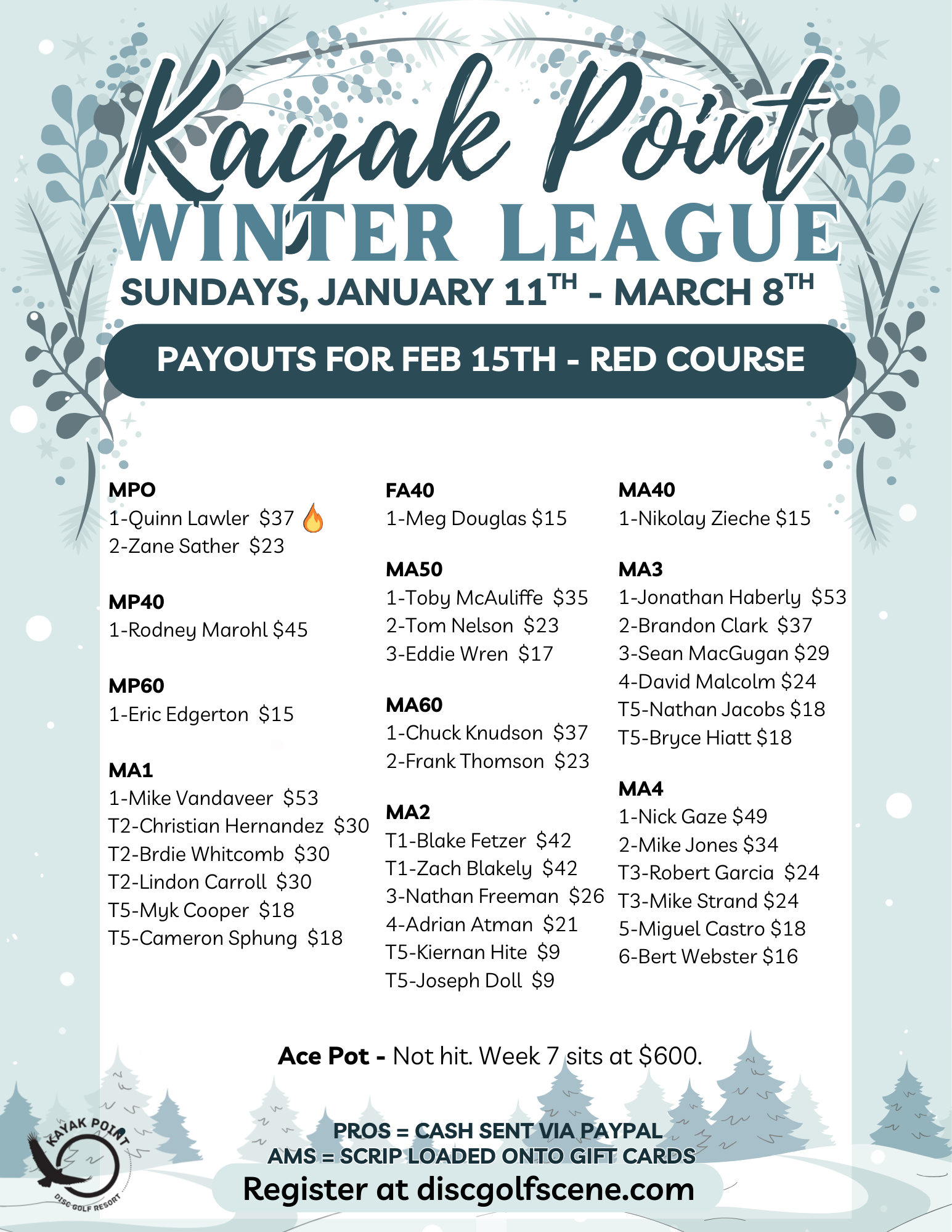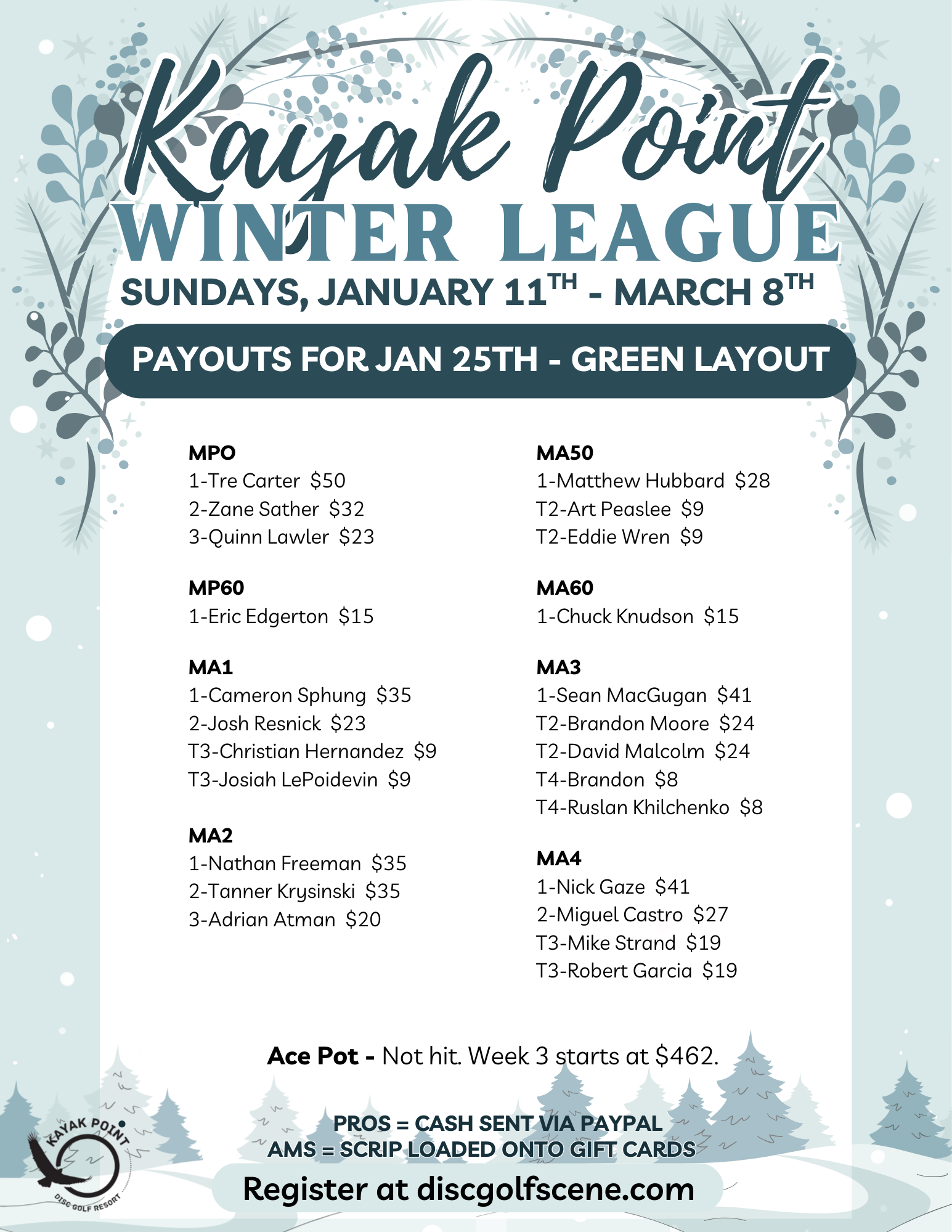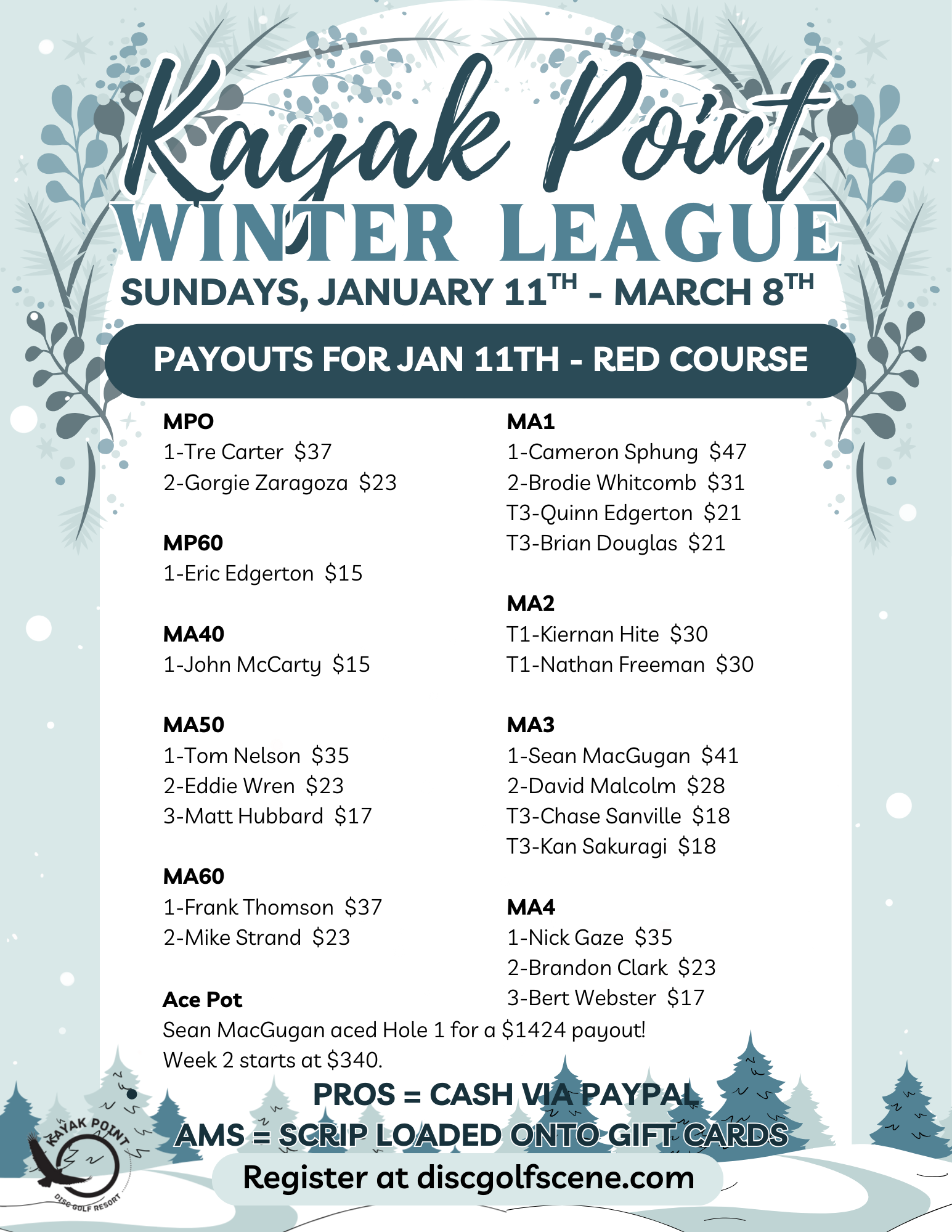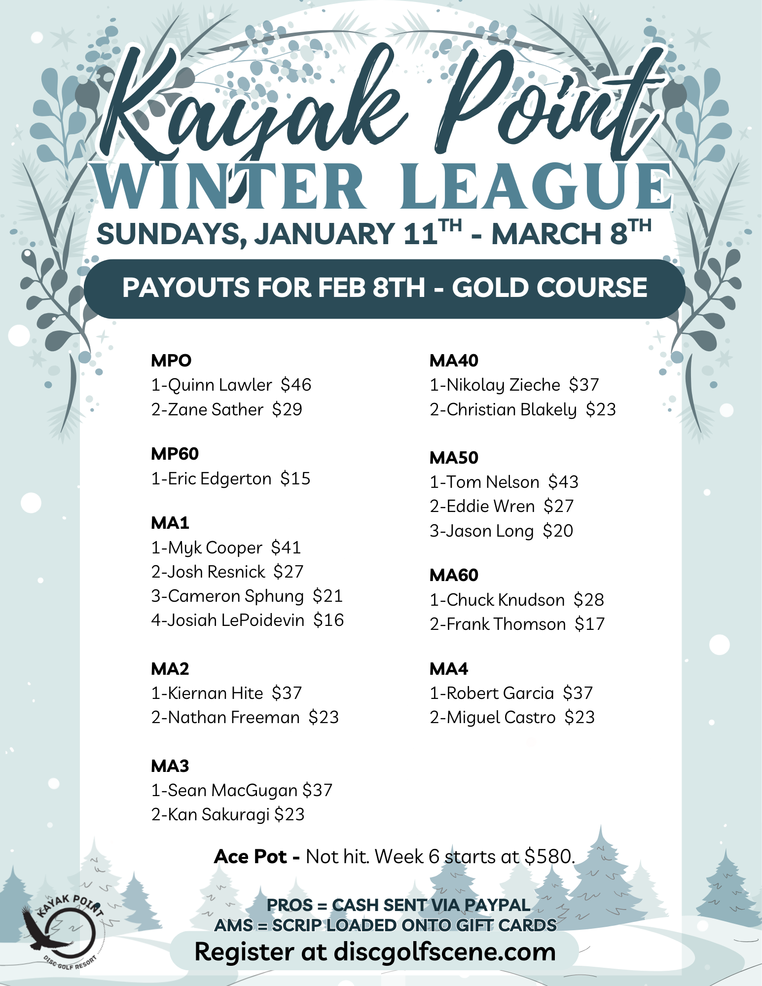 Payouts will happen following each event with cash via PayPal for Pros, and scrip for Amateurs will be loaded onto gift cards in the Pro Shop. Scrip can be used on anything on the property. After each event, a link to view the payouts will be added below. Payouts will also be shared through our Facebook and Instagram pages, as a Picture on the Disc Golf Scene event page, and on the Events Bulletin Board in the clubhouse.