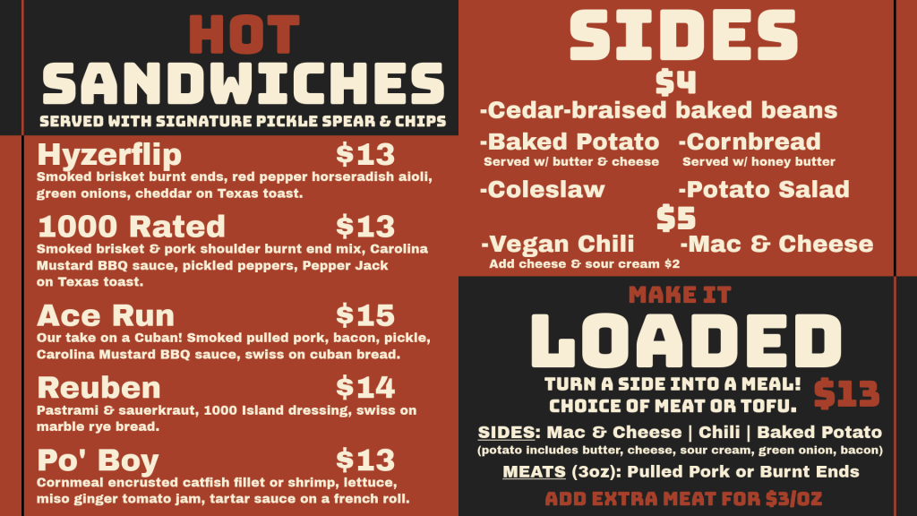 Aces BBQ offers in-house smoked meats, burgers, hot sandwiches, wings, and a variety of smaller bites and sides, plus cold draft brews and non-alcoholic drinks options.