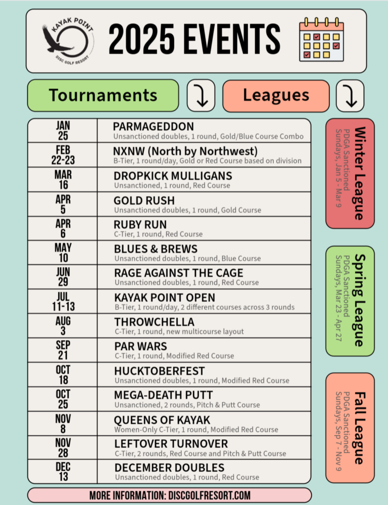 Kayak Point Disc Golf Resort is excited to announce the 2025 Event Schedule for all planned disc golf tournaments and seasonal league series!
